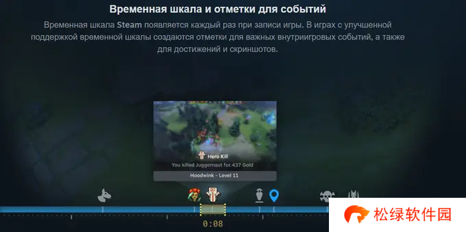 此外,V社还为DOTA2等游戏在录制视频的时间轴中增加了重要事件以及成就的标记,以便玩家精准定位。