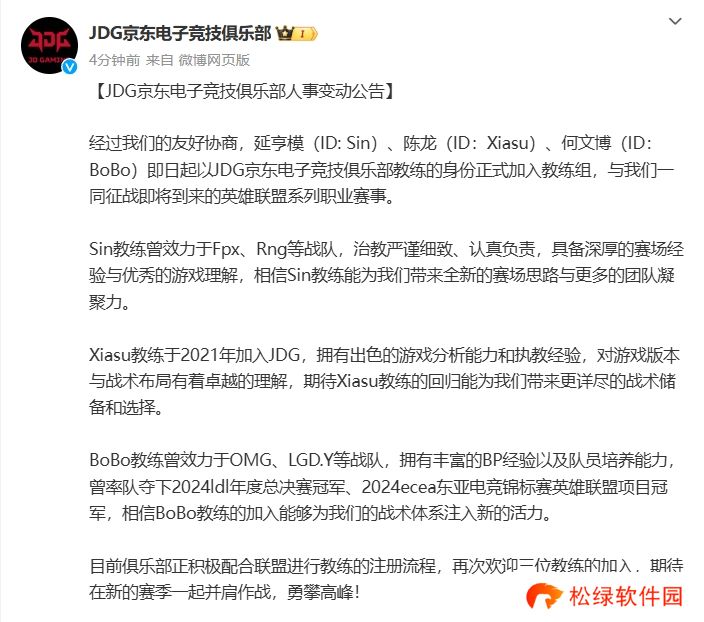 直播吧12月10日讯 官方消息,JDG俱乐部在刚刚公布三则人员变动公告;Sin、Xiasu、BoBo三名教练加入教练组。