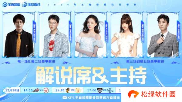 解说席&主持人:解说美梦 (闵子端)、解说老王ww (王华斌)、灵儿chili (刘宁)、解说琪琪 (杨泽琪)、解说潇洒洒 (李潮)
