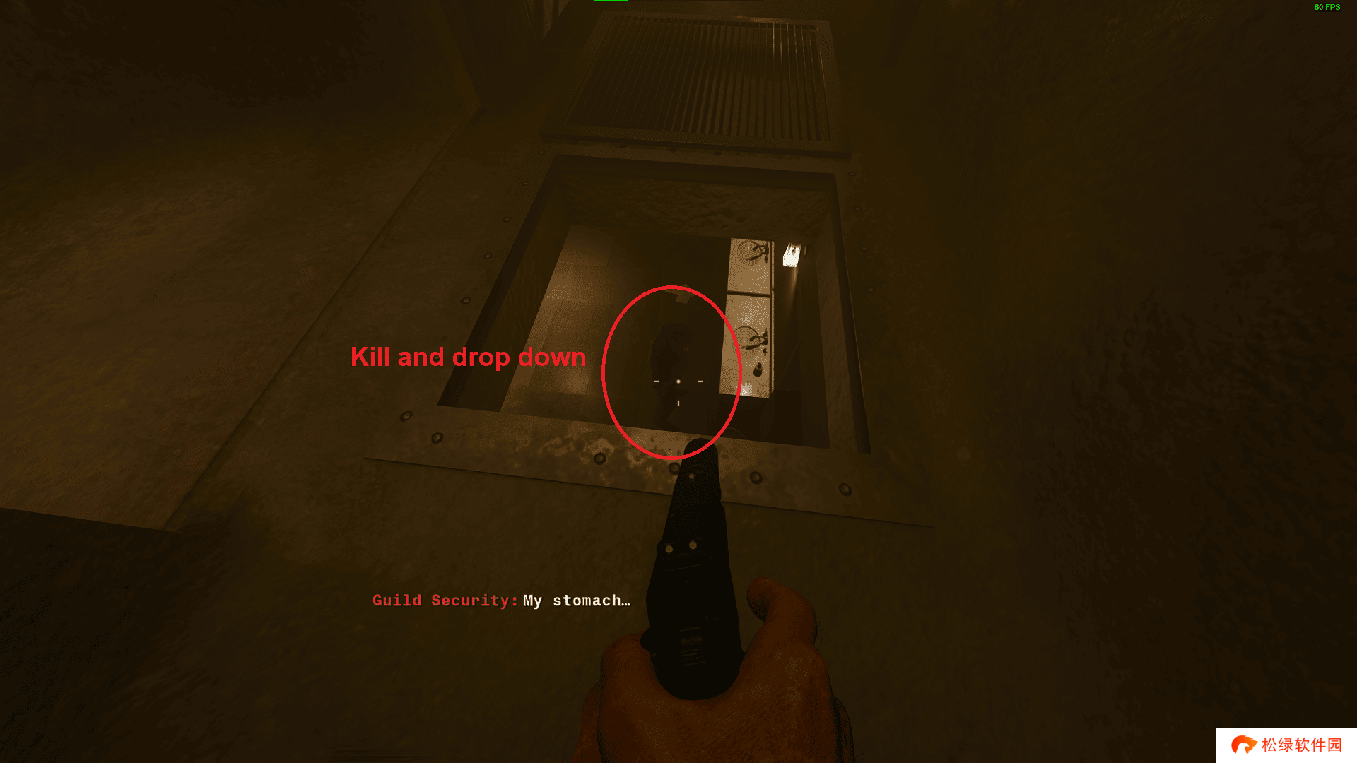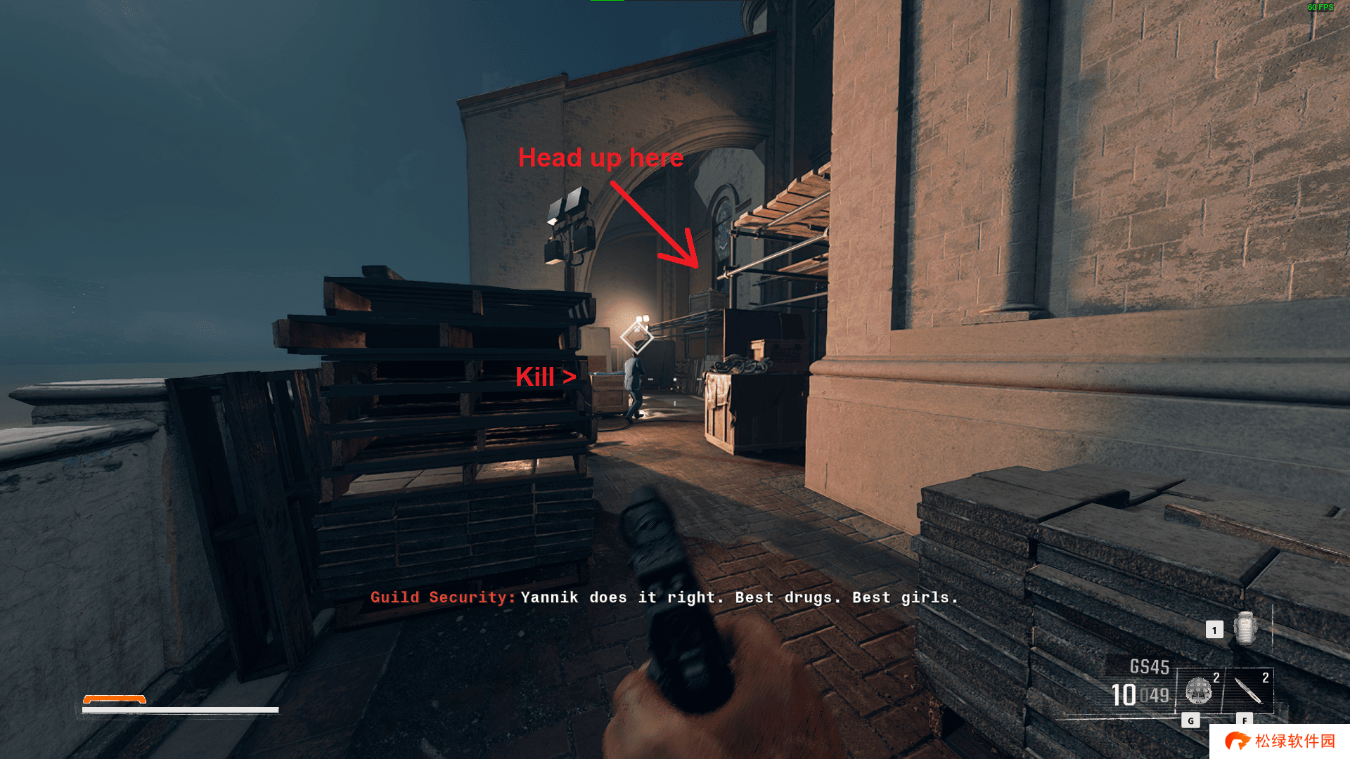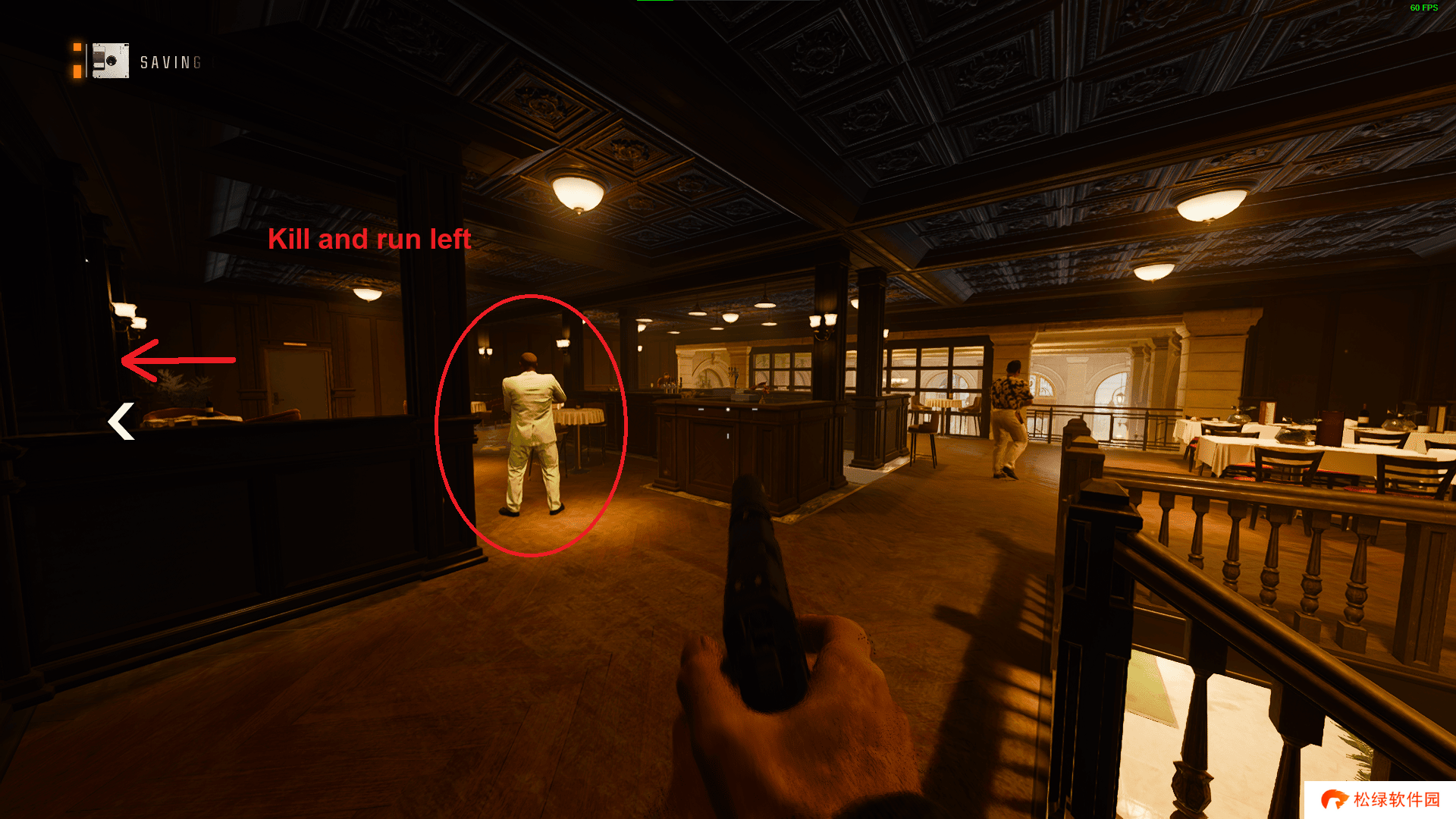 在短暂的过场之后,从左边的小巷进入餐厅,然后在通风口左转,把洗手间的保安赶走。