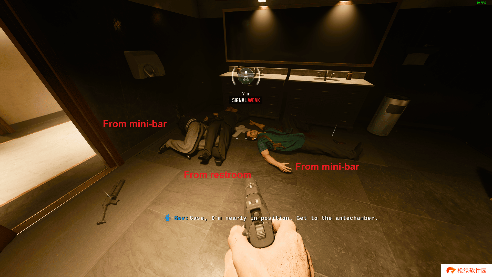 通过发出声音或让他们看到你到足以怀疑的程度,引诱剩下的两名警卫进入洗手间,然后躲回洗手间。当他们靠近时杀了他们。然后蹲下,安静地走上楼梯。在楼梯顶部,等待左边的警卫背对,右边的警卫走开,然后杀死左边的警卫,走到左边的门前。糟糕的成就:)