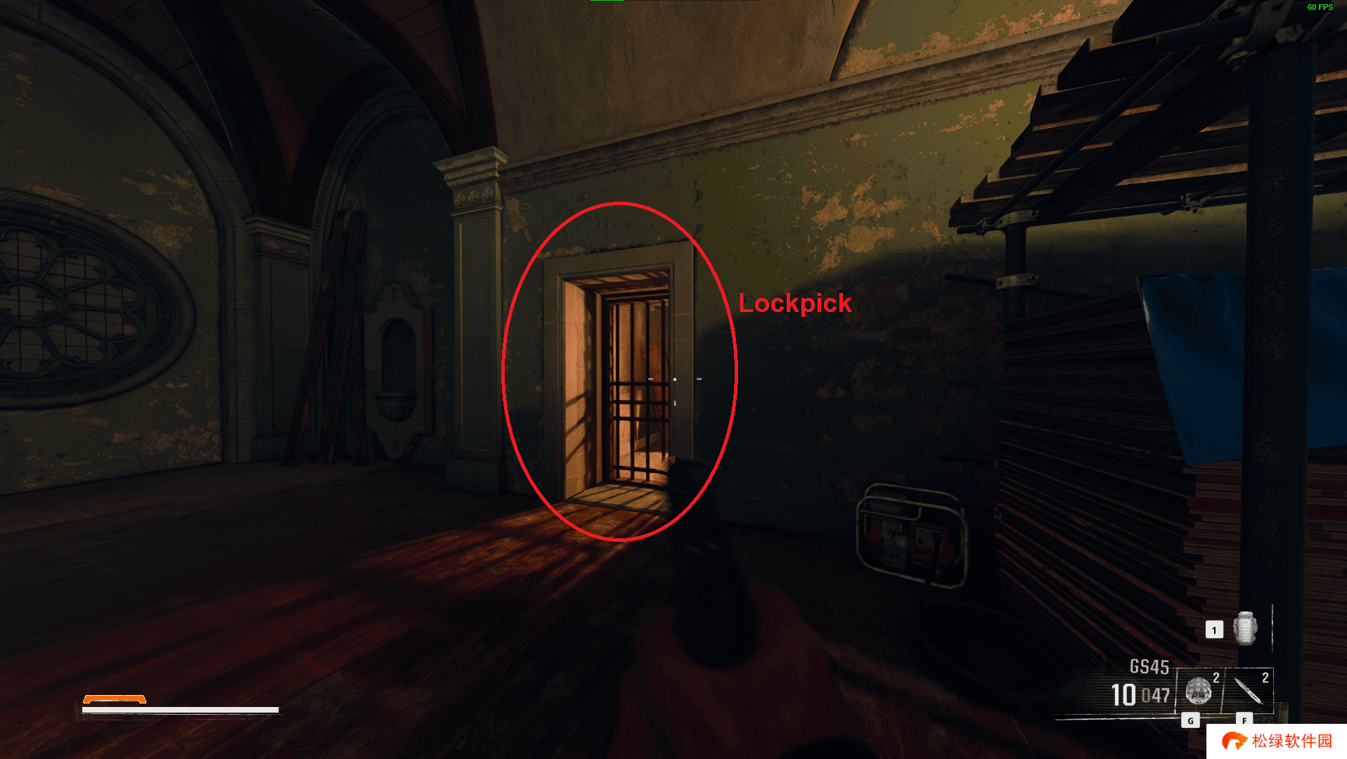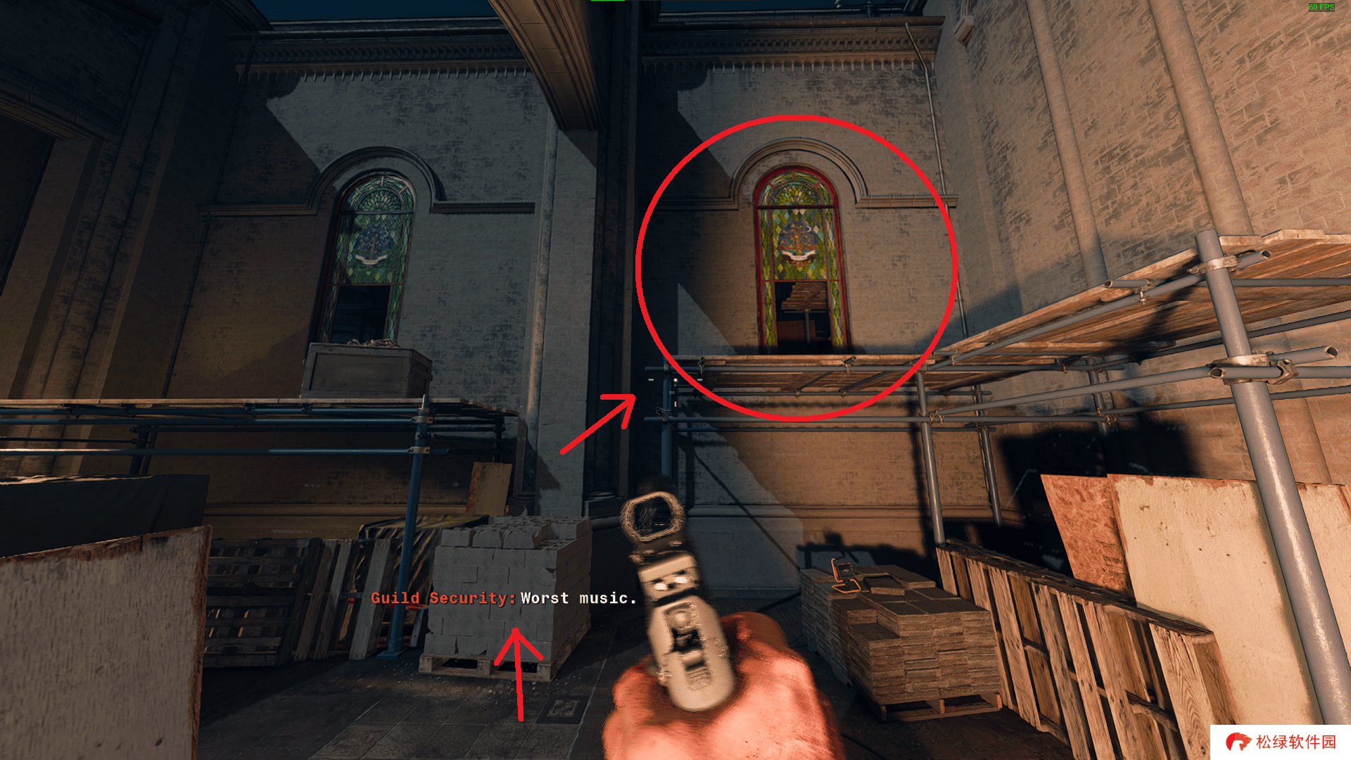 走上楼梯后,左转,沿着脚手架走。干掉附近的敌人,然后爬到你右边打开的窗户前。进入后右转,发现一扇锁着的酒吧门,这就是钟楼入口。爬上梯子。