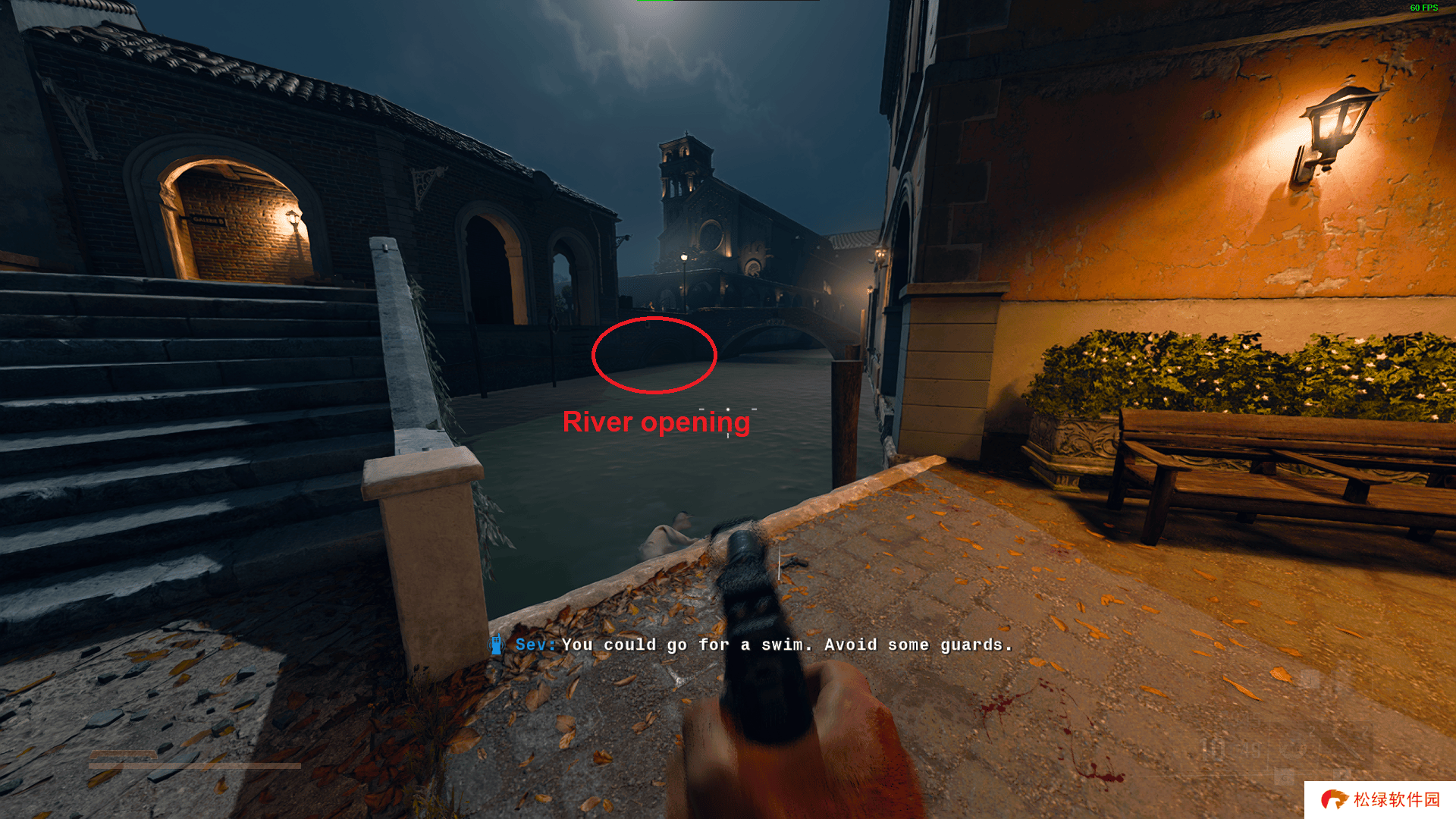 在任务开始时,把河边的守卫带出来,然后朝左手边的一个河口走去。游过隧道,出口后右转,朝楼梯走去。