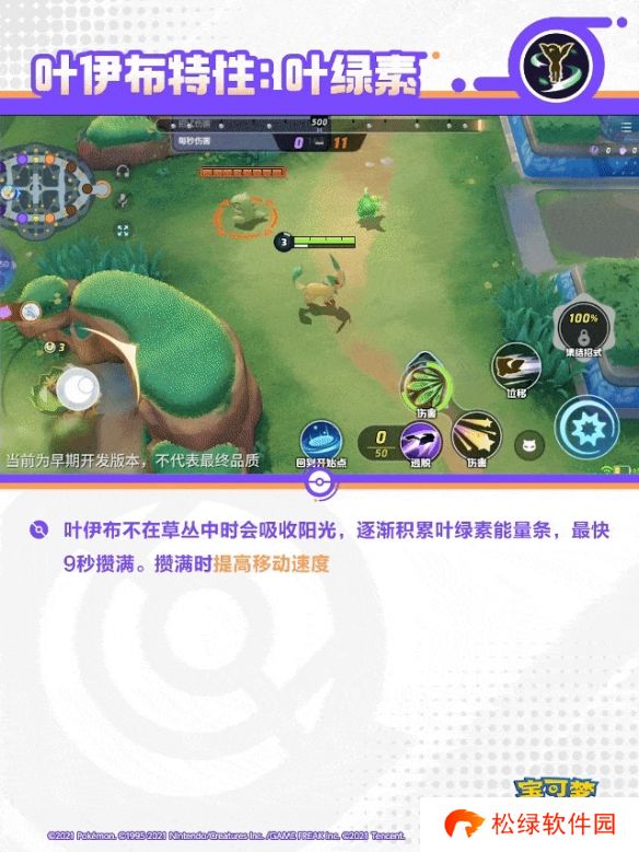 叶伊布不在草丛中时会吸收阳光,逐渐积累叶绿素能量条,最快9秒攒满。