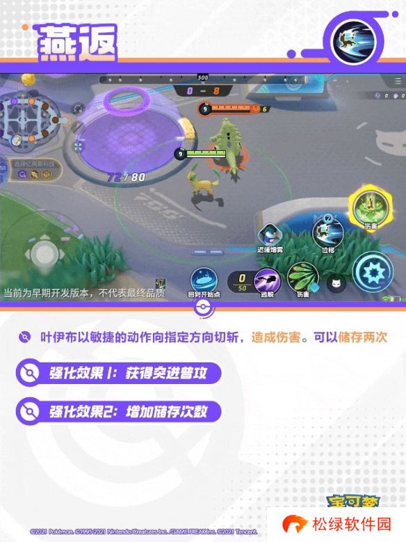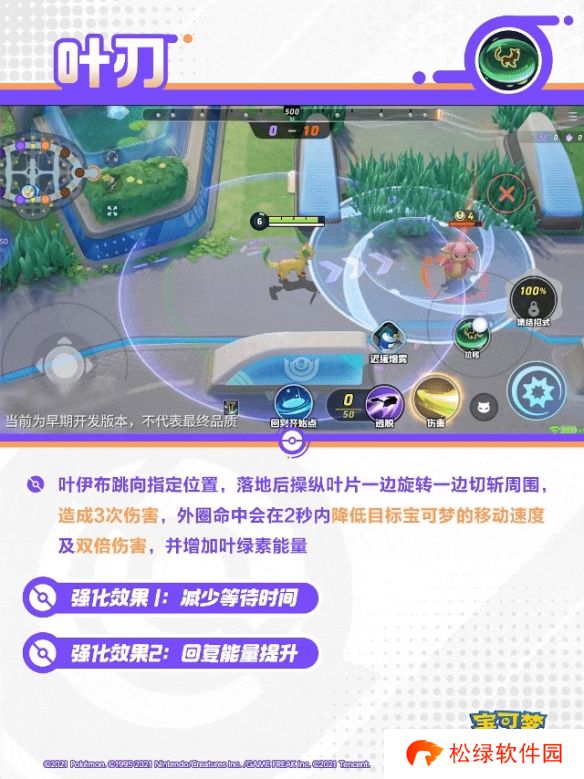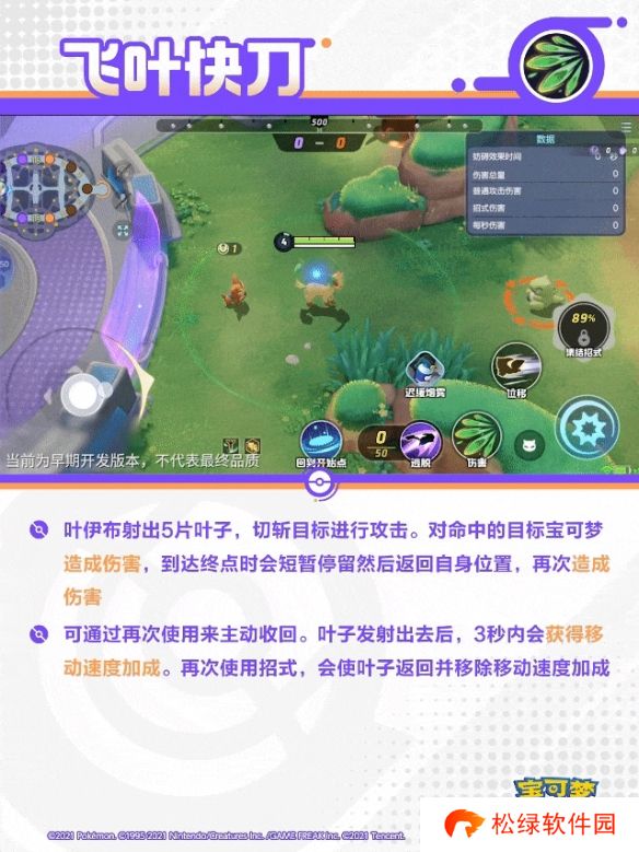 叶伊布跳向指定位置,落地后操纵叶片一边旋转一边切斩周围造成3次伤害,外圈命中会在2秒内降低目标宝可梦的移动速度及双倍伤害,并增加叶绿素能量