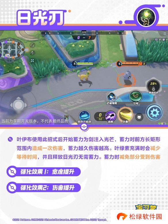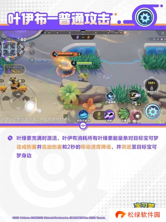 叶绿素充满时激活,叶伊布消耗所有叶绿素能量条对目标宝可梦造成伤害并追加伤害和2秒的移动速度降低,并突进至目标宝可梦身边。