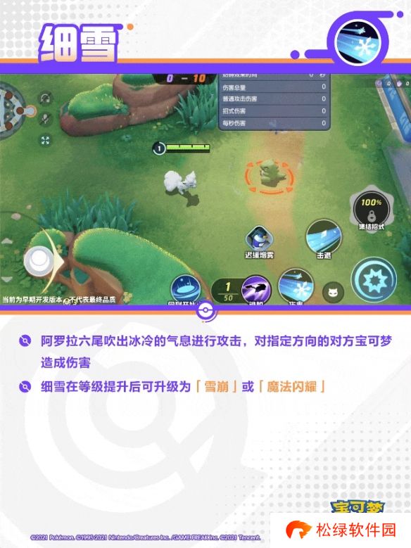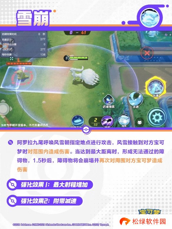 间接性地降下冰雪,对范围内的对方宝可梦造成伤害,并在0.8秒内对其造成减速效果。