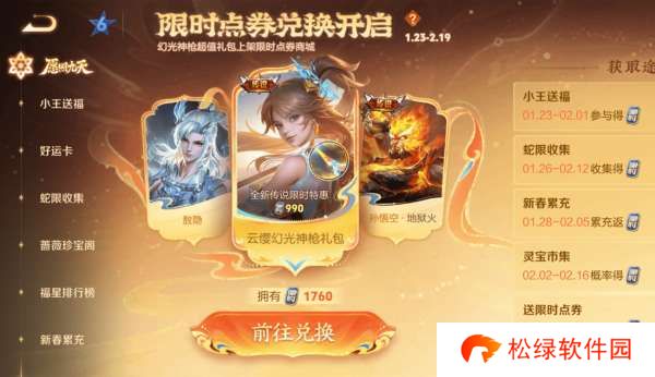 此外,2月2日还会开启灵宝市集和新的皮肤活动,这里要说到限时点券,对于限时点券的用处,无论是玩云缨还是不玩云缨的小伙伴,都建议先兑换幻光神枪,为什么这么说呢?