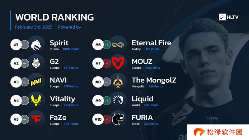HLTV本周世界排名:Spirit蝉联第一 EF刷新俱乐部史高排名