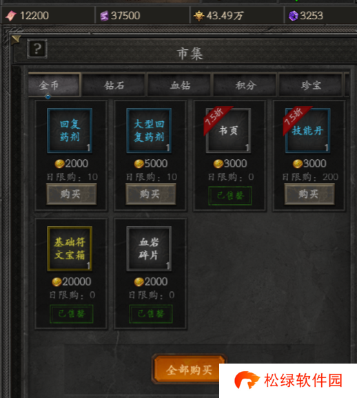 金币商店:书页、符文(金币充足再买)、血岩碎片(金币充足再买)