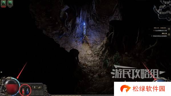 红球旁有个两个小瓶子,分别是血瓶和魔力药瓶,回城靠近水井或者在探索地图时靠近记录点石碑可恢复充能次数。下图中有蓝色火光的石碑就是记录点石碑,死亡后也会在这里复活。