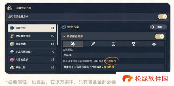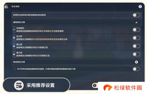 推荐的「通用锁定方案」和「套装锁定方案」均已按照常见用途设置好自动锁定的属性。并且随着游戏的更新,开发组还会对推荐套装方案进行调整,无需旅行者重复操作。如果想要方便省事,可以直接一键开启;如有更细致的个性化需求,可以给各套装或部件设置单独的方案。