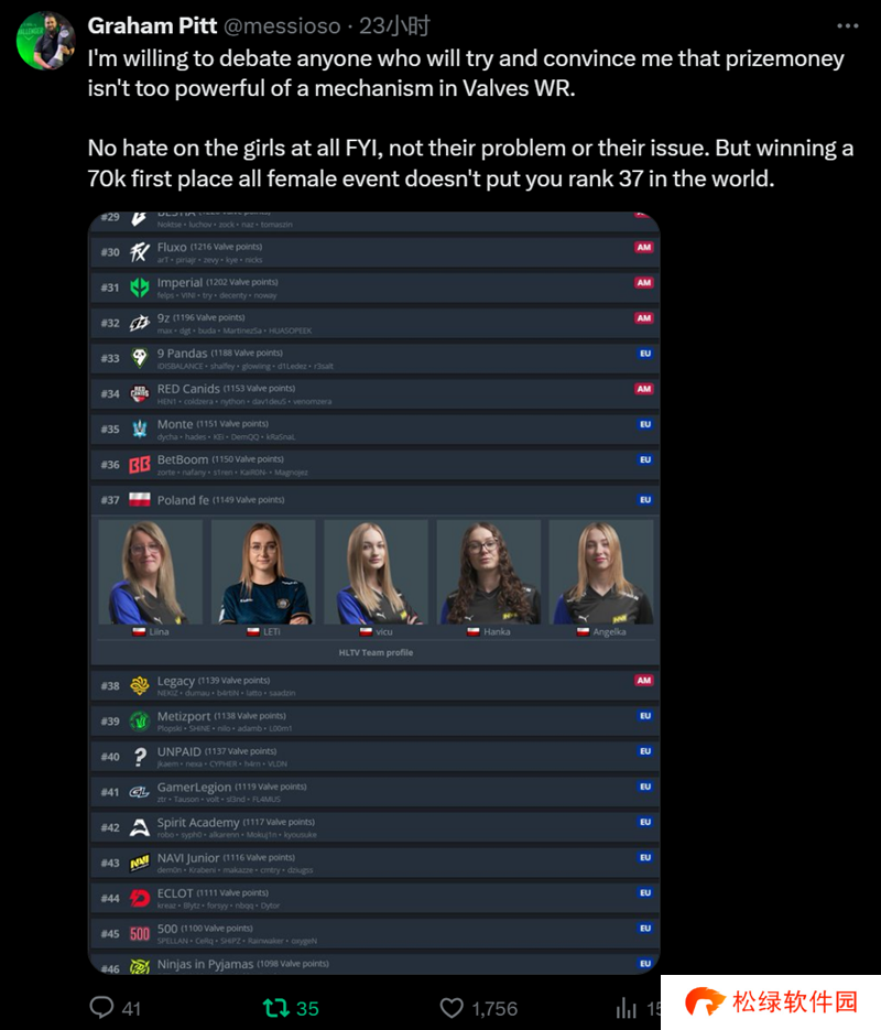 Poland fe的女子战队位列37名,这些娘子军当前有着1142的V社积分,高于