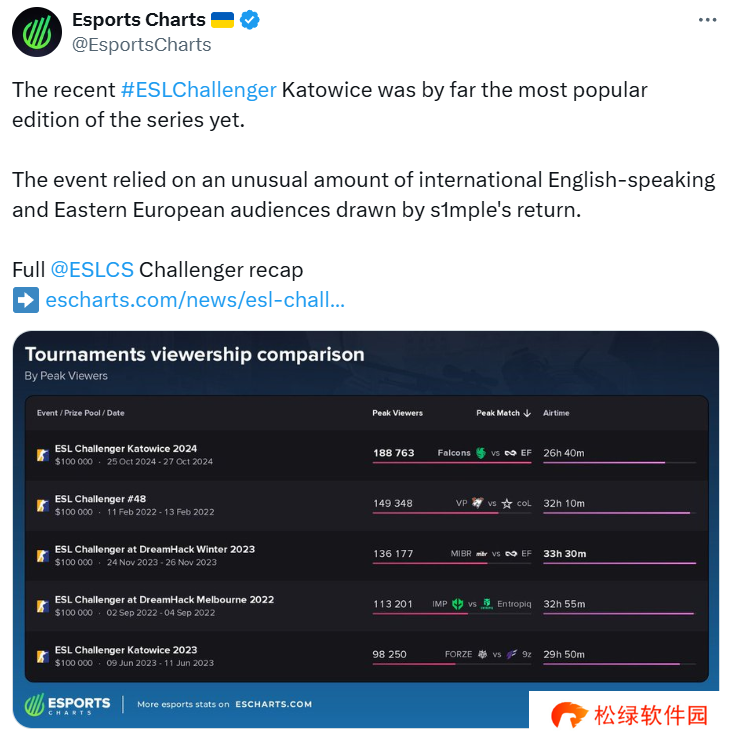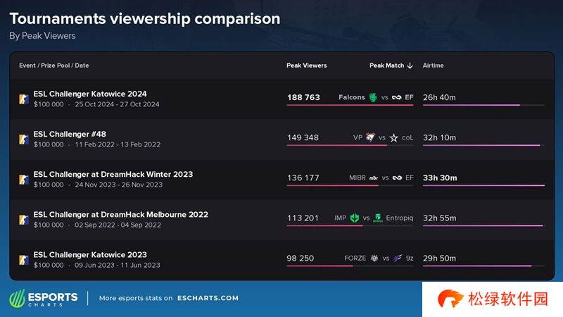 根据外媒Esports Charts的数据显示,最近的ESL 挑战者 卡托维兹站无疑是该系列赛事中最受欢迎的一届。