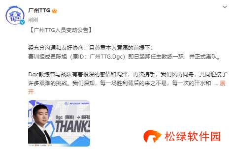 【广州TTG人员变动公告】经充分沟通和友好协商,且尊重本人意愿的前提下:赛训组成员陈旭(原ID:广州TTG.Dgc)即日起卸任主教练一职,并正式离队。Dgc教练曾与战队有着很深的感情和羁绊,再次携手,我们风雨同舟,共同迎接了许多艰难的挑战。我们深知,每一场胜利背后的来之不易,每一次的汗水和努力都不可磨灭,也明白前路荆棘丛生,但这一路走来我们从未想过要放弃。在Dgc教练执教期间,他一直苦心钻研战术,认真负责,凭借自己丰富的执教经验,为团队注入能量。我们在此衷心感谢Dgc教练在执教期间的付出和不辞辛劳,尽管前方是一条分岔路口,但也祝愿Dgc教练未来前程似锦,鹏程万里!