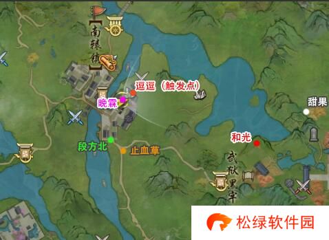 3、对话结束后去找【段方北】然后在三岔路口摘止血草回来给【段方北】敷药;