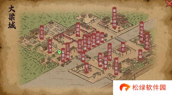 3、交完钱后就可以获得【大梁城地图】了,大家打开这个地图可以看到有很多建筑,帮助大家更好的探索。