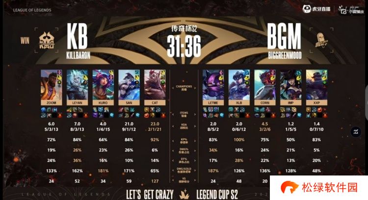 本场比赛对线期KB多线优势,Leyan佛耶戈拿资源入侵宛如回家,XLB猪妹苦不堪言!12分钟Leyan队就拿下6K经济优势!KB轻松推进压制,虽然BGM高地团连守两波,一度将经济差从12K拉回到6K左右但是无济于事,KB大龙团依靠Kuro妮蔻闪现绕后坐大四个终结比赛!拿下第七胜,常规时间内还没输过!