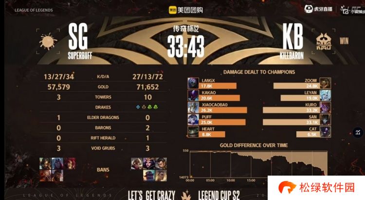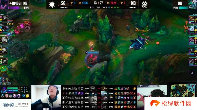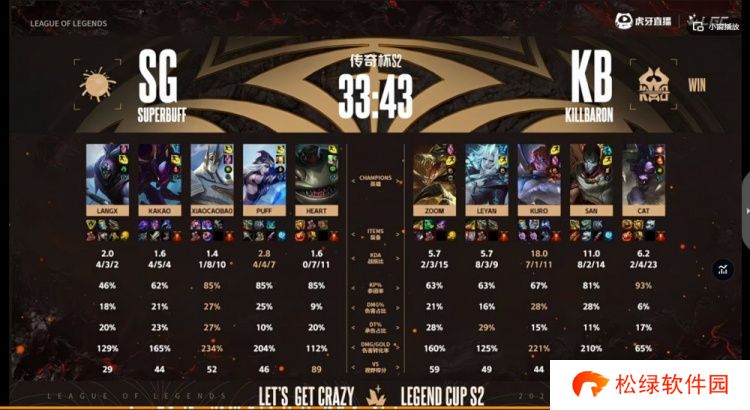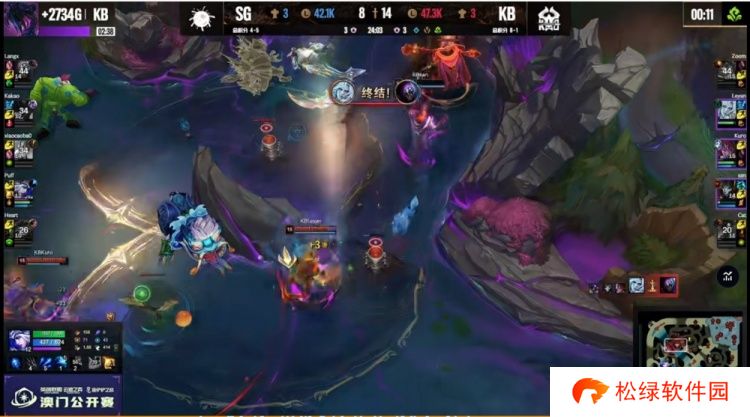 本场比赛前期KB拿下经济优势,但是中期直接开送被SG一度将经济差拉回到2K!不过的关键大龙团前Kakao卡兹克被抓,Leyan佛耶戈在龙坑里配合队友收割完成超神,随后的远古龙团xiaocaobao加里奥落单失误被秒,KB拿下第二条大龙+远古龙,三龙汇一波结束比赛,拿下第九胜!