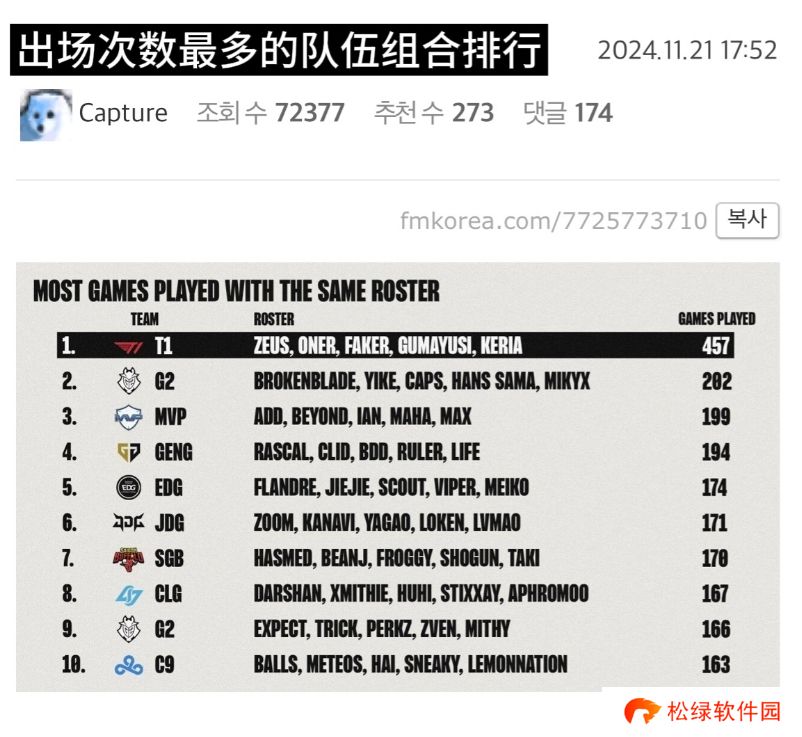 直播吧11月22日讯 近日T1官宣上单Zeus离队,这也代表着T1的五人组合ZOFGK时代的结束。同时他们也是历史上出场次数最多的五人组合,出场次数高达457场;要远高于G2阵容的202场。