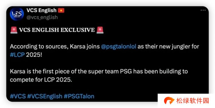 直播吧11月22日讯 VCS英文推特账号官宣,打野选手Karsa将加入PSG担任他们2025年参加LCP联赛的新打野。