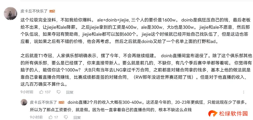 Ale+Doinb+Jiejie,三个人的要价是1600w。Doinb是疯狂压自己的钱,最后老板给不出来,让Jiejie和Ale降薪。 之后Jiejie拿到的工资是400w,Ale是300w,**也是300w。 Jiejie和Ale不愿意,然后那个队伍说,如果夺冠有赞助商,jiejie和ale都可以加到600个。Jiejie这个时候就已经开始自己找队伍了,但是这边也答应着,说如果之后有不错的价格,他会再考虑。