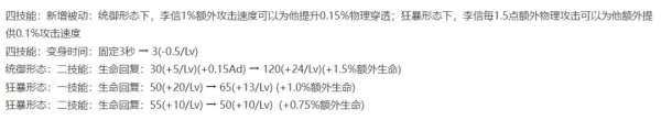 策划主要给李信新增了属性转化的被动,让光信可以把攻速转成物穿,暗信则能把额外Ad转成为攻速,此外,还缩短了后期变身的1秒CD,同时,也提升了两种形态的回复数值,基础增幅高达20%。