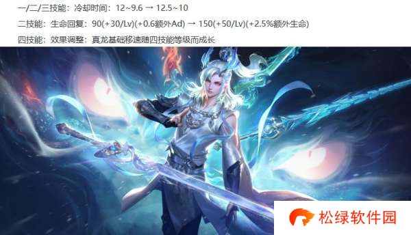 敖隐削弱:1/2/3技能的CD增加0.5~0.4秒,2技能的前期回血增加,且回血改为额外生命加成,4技能真龙的移速随技能等级变化。