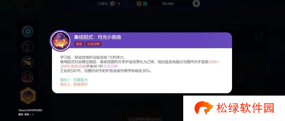 “月光小夜曲”学习后,脱战会每秒回复自身1%的体力。使用招式时会腾空跳起,吸收周围的对手护盾效果化为己用,随后猛击地面对范围内对手造成500(+200%攻击)伤害并使其1秒无法动弹之后的5秒内,范围内对手的护盾会被月亮伊布吸收30%。