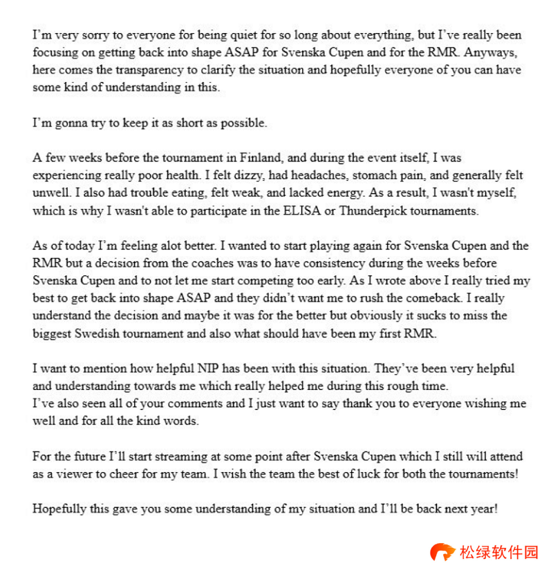 “很抱歉我这么长时间以来都保持沉默,但我真的一直在专注于尽快恢复状态,为瑞典杯和RMR努力。无论如何。现在我尽可能简短的澄清情况,希望每个人都能对此理解。