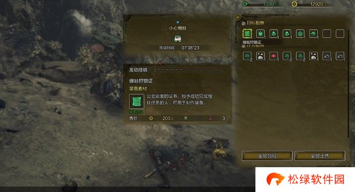 在完成任务后显示的任务结算界面中,可以领取怪物素材等任务报酬和报酬金(金钱)。