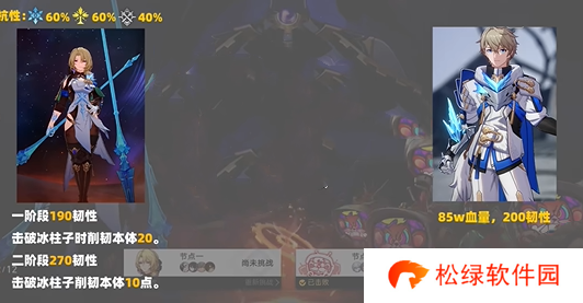 3、具体打法:全程集火可可利亚本体进行输出,不用考虑冰柱子和杰帕德,阵容练度太低则需要考虑破韧杰帕德,上半生存压力较为一般,带加拉赫即可,将砂金和灵砂放在下半。
