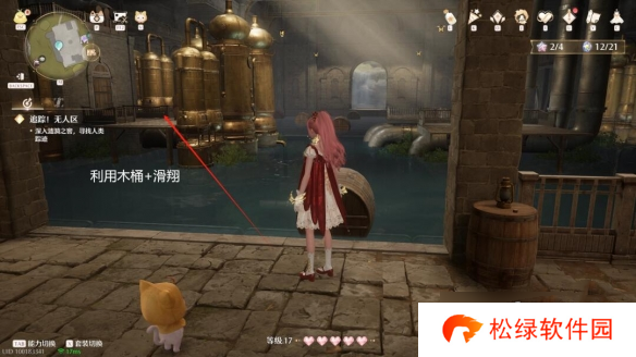 10、跳到水中的大木桶上,注意收集两侧的灵感露珠,此处可得5个灵感露珠。
