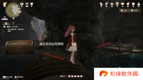 4、继续前进,收集前方的两个灵感露珠,在过山车最后一个坡的最高长按跳跃,进入漂浮状态。
