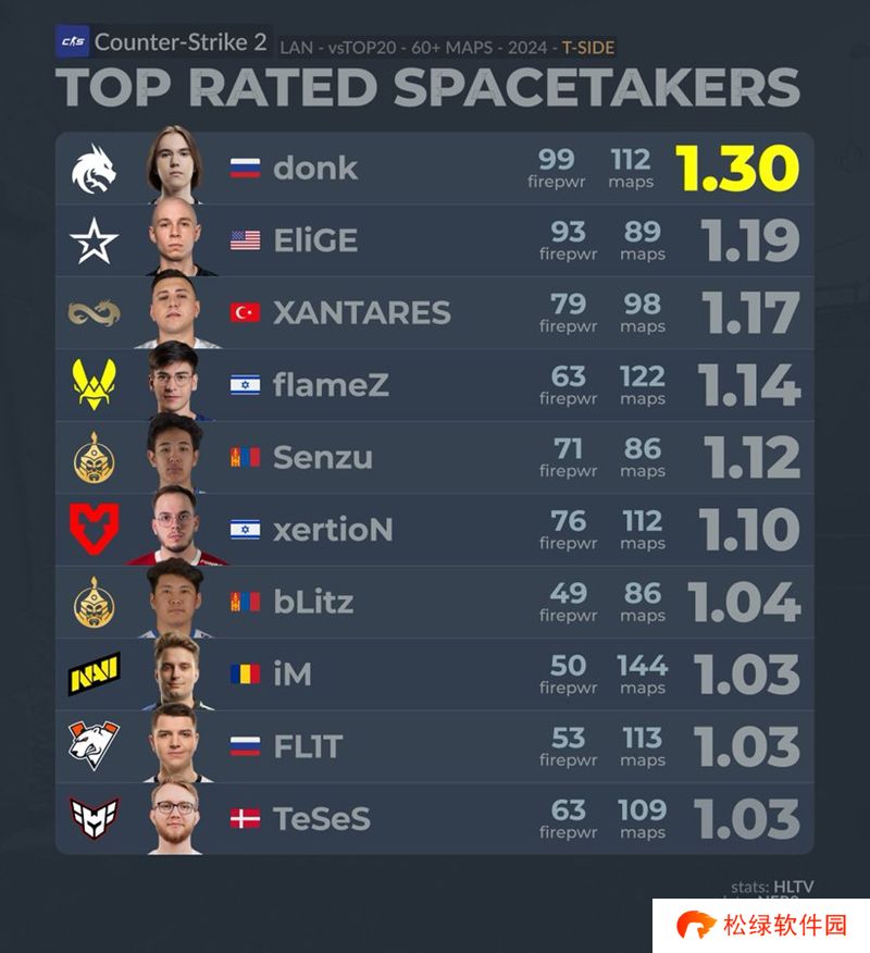 从数据看,donk最能为队伍争夺地图控制权,他在112张地图上凭借99的火力值拿到了1.30的rating;第二名是EliGE,89张地图93的火力值,1.19 rating;第三名是XANTARES,98张地图79的火力值,1.17 rating。