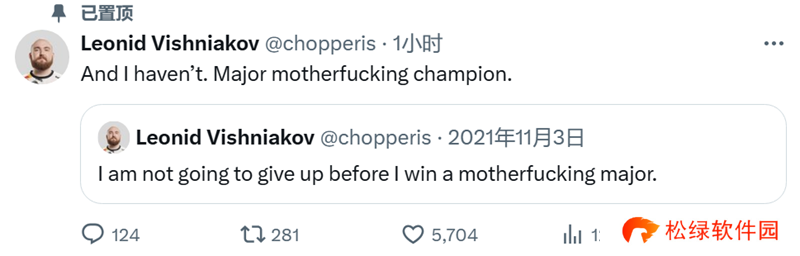 在2021年,chopper在社交平台上置顶了一条动态:在赢下Major之前我永远不会放弃。而三年之后他捧起了职业生涯首座Major奖杯。chopper也评论了这条动态:“我没有放弃,Major冠军!”