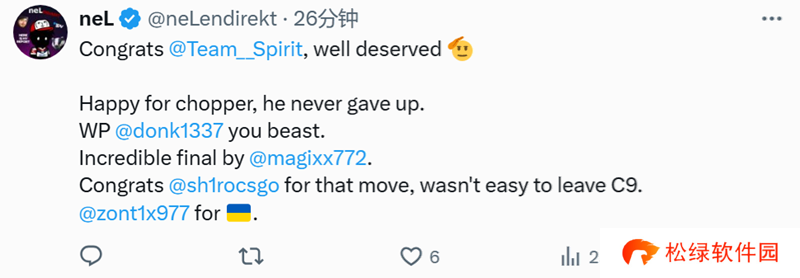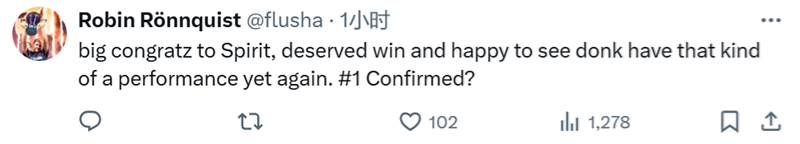 Robin Rönnquist | flusha:祝贺Spirit,他们实至名归。另外很开心看到donk能再度有那样的发挥。Top1确认了?