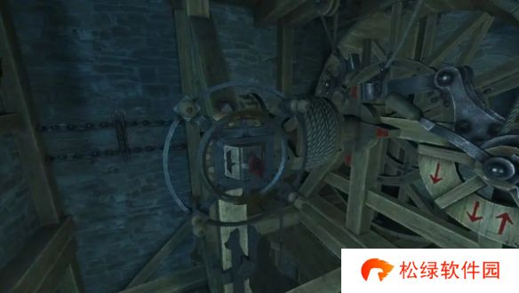 11、将绞轮机关部件插入凸形槽中,再旋转绞轮,装置被推出,回到楼上,向左拉动把手,再拉动电梯把手,旋转绞轮转轮,使通向楼下的绳子降落。