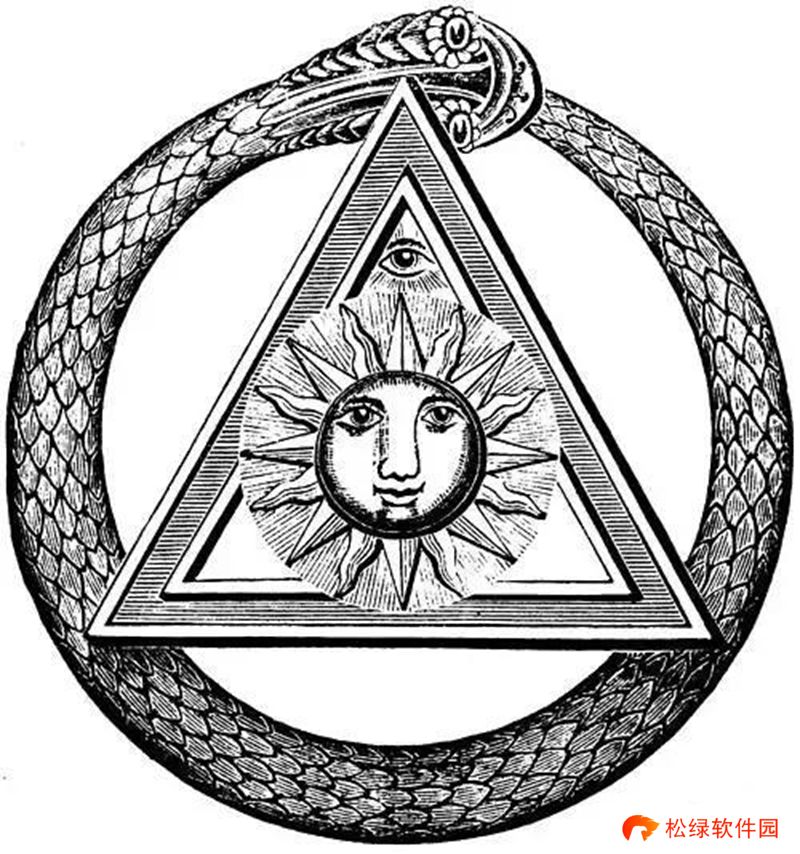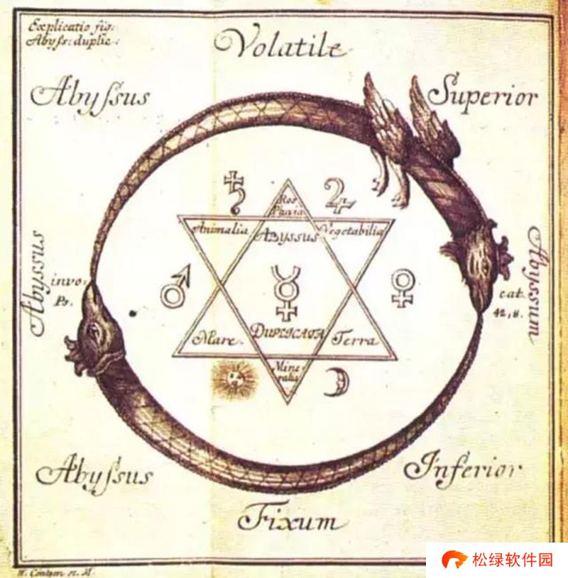 衔尾蛇是一种诺斯底主义和炼金术的符号,表达了所有事物的统一性,无论是物质的还是精神的,它永远不会消失,而是在毁灭和再创造的永恒循环中不断改变形式。