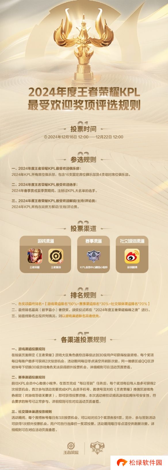 各奖项最终排名=游戏渠道排名*50%+赛事渠道排名*30%+社交媒体渠道排名*20%,最终排名最高(数字最小)者获奖,颁奖仪式将在“2024年度王者荣耀巅峰之夜”进行。