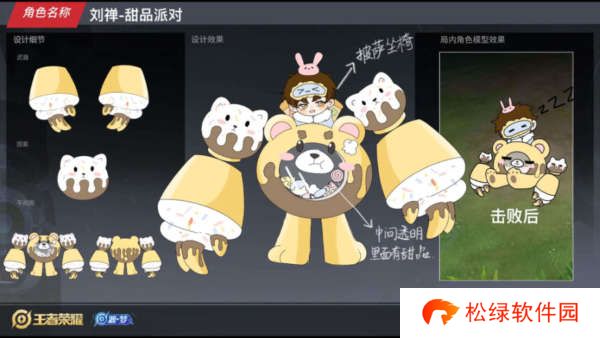 接下来我们再来看刘禅的第二个设计图,这款皮肤名为甜品派对,刘禅的模型是以黄色为主色调,刘禅的坐骑是玩偶形态的,肚子上面还有小熊的样子,看着特别的可爱。