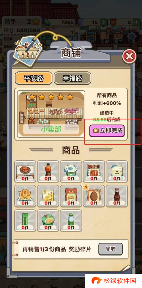 3、耐心等待片刻,直至建造过程顺利完成,随后点击“立即完成”按钮,小卖部商品利润将提升至600%。