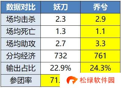 妖刀在上一场对阵杭州LGD.NBW的比赛里可以说几乎用不着发力,获胜的四局用时都只有十来分钟,跟着队友推推塔就行。擂台赛阶段本就不高的数据,再遇上这种队友带飞局,本就排名发育路倒数第一的输出占比进一步降到22.9%。
