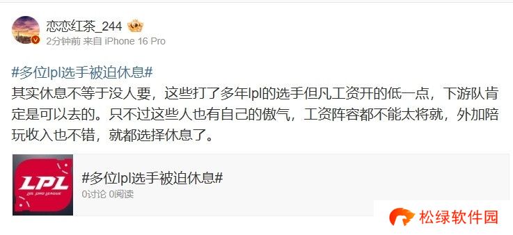 直播吧12月17日讯 2024LPL冬季转会期结束,多位LPL选手选择休息,对此LPL知名爆料人发文点评:这些人也有自己的傲气,工资阵容都不能太将就,外加陪玩收入也不错,就都选择休息了。