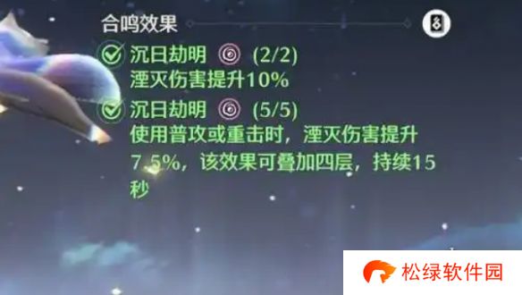 2、五件套:使用普攻或重击时,湮灭伤害提升7.5%,该效果可叠加4层,持续15秒。