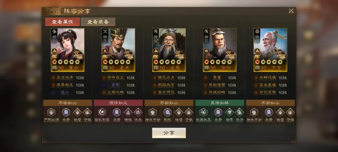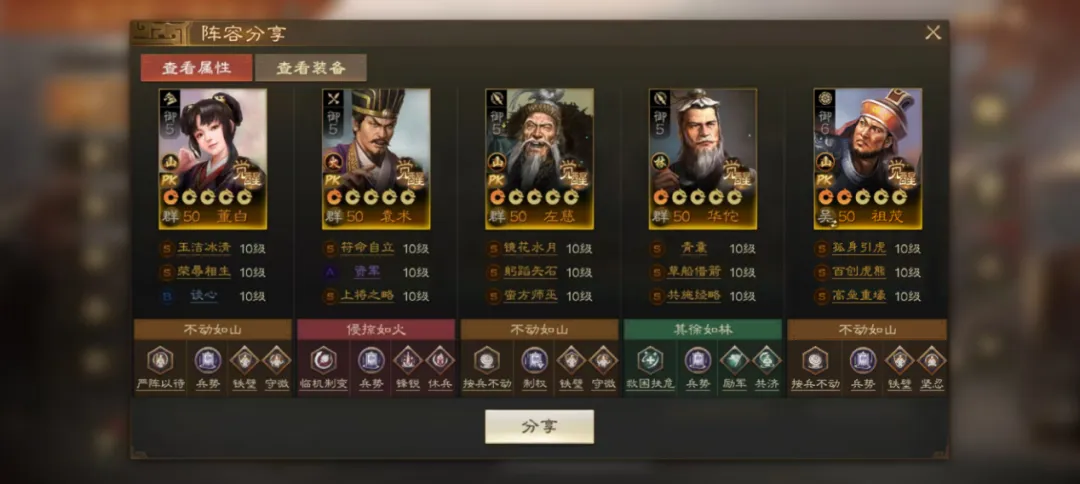玩法思路死保袁术和于吉,董白给袁术增加全属性和谈心智力,使得资军+上将的收益提升,从而达到“1+1>2”的效果。首回合即可全员“王佐”,利用左慈高智力复制对面输出,即可实现“复制体比本体更强”的效果,如果有人要和袁神比后期,那他一定没有被袁神启动过。