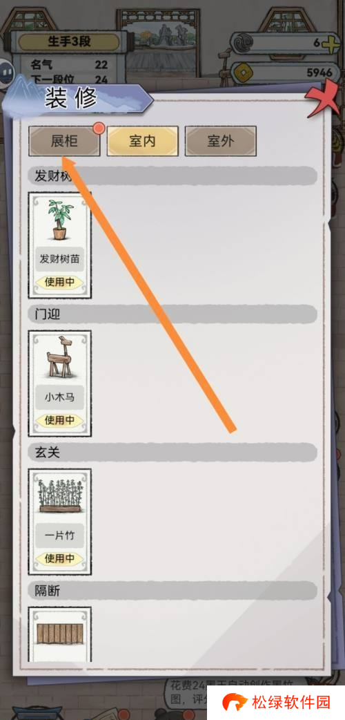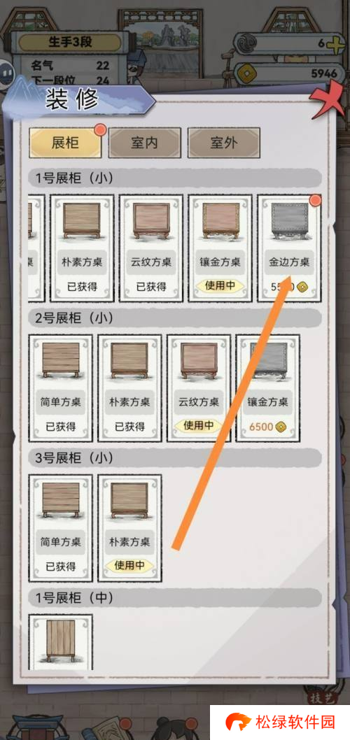 2、成功进入装修区域后,请在页面的底部找到并点击“展柜”一栏,随后在编号1的展柜中,您将能够发现带有金边的方形桌面。