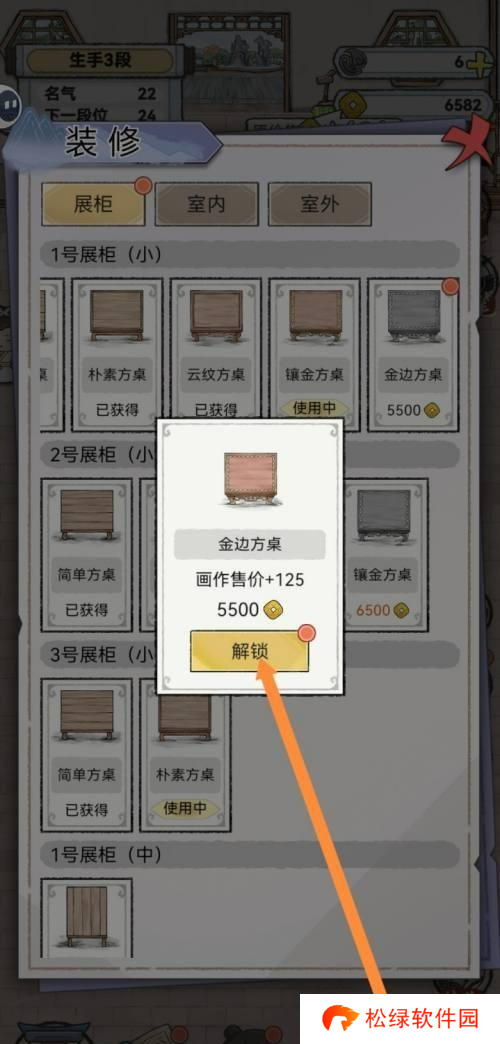 3、接着,对金边方桌进行点击以查看详细信息,按下“解锁”按钮,并支付5500枚金币以取得该物品。一旦拥有,该物品会使您的画作销售价格增加125金币。