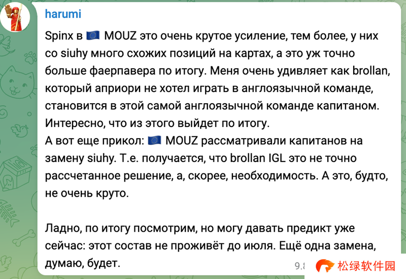 MOUZ宣布下放指挥siuhy并签下Spinx之后,独联体知名爆料人harumi在个人社交媒体账号上分享了自己的看法。认为Brollan担任指挥只是紧急决策,还会有新的指挥人选出现。