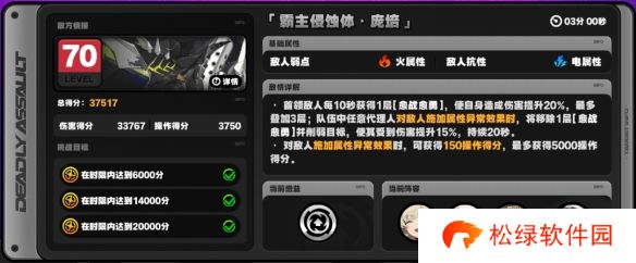 弱火+电抗,BOSS会给自己上BUFF,每10秒提升20%伤害,对敌人施加异常时就会移除1层并使其获得15%的易伤效果,持续20秒,因此本关的生存压力比较大,需要多上异常状态,从而增强自身,削弱敌人。操作得分就是频繁施加异常,不需要特意关注。